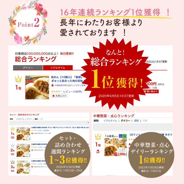 | 内容量 | 肉まん3個 / 黒豚生餃子15個 / 黒豚シウマイ5個 / エビシウマイ5個 / 海老ニラ焼まん5個 / 小龍包6個 / ゆずまん3個 / 花茶1個 |