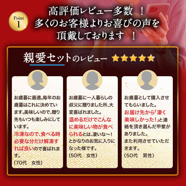 | ご注意ください | 加熱してお召し上がり下さい。輸送上の安全のため冷凍状態にしております。ご家庭でも冷凍で保存してください。 |