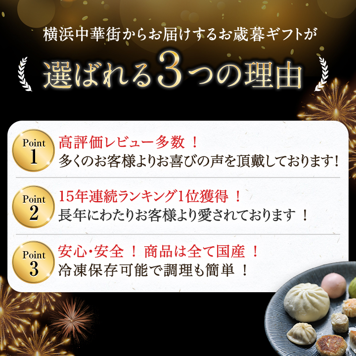 | 内容量 | 肉まん6個 / あんまん3個 / 中華風牛鍋まん2個 / フカヒレ入りまんじゅう2個 / 水餃子15個 / 黒豚生餃子15個 / 黒豚シウマイ10個 / エビシウマイ5個 / 小籠包6個 / ゆずまん3個 |